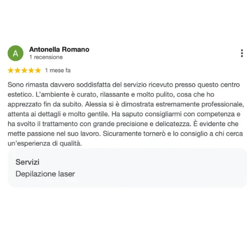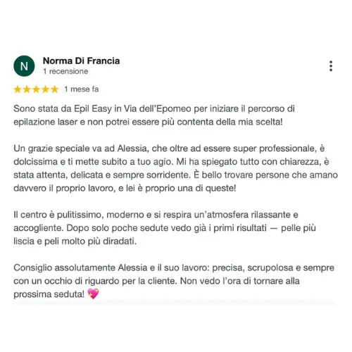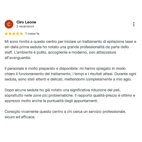 Questo non è un semplice sconto, ma la nostra garanzia di risultato. Per soli 12,90 € (un prezzo simbolico), ti assicuriamo la tua prima sessione completa. Se non rimarrai sorpresa dall'efficacia del nostro protocollo e del nostro laser, non tornerai. Il risultato finale? Pelle liscia, addio peli incarniti e follicolite. Smetti di pagare inefficienze.